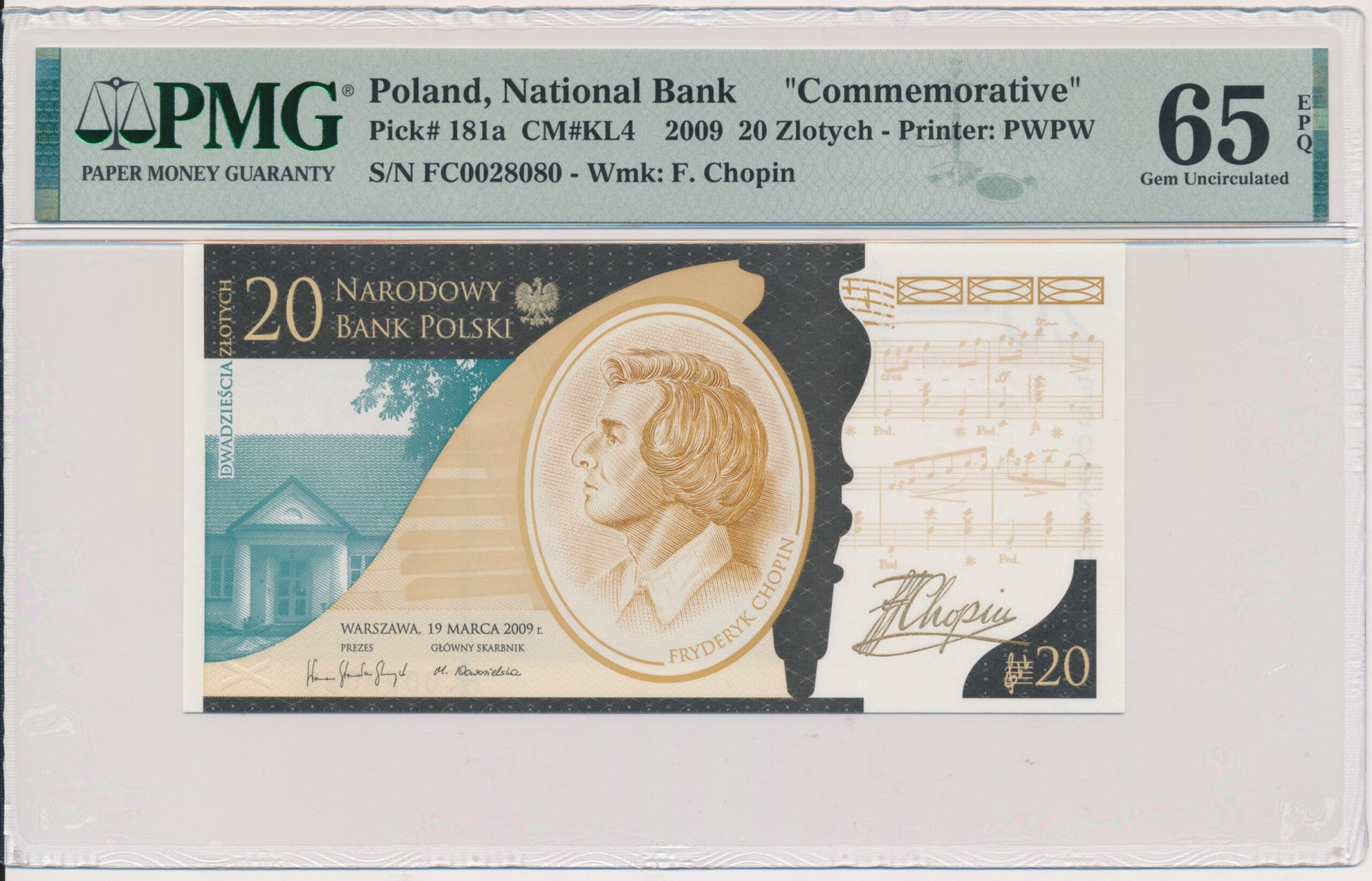 Banknot 20 złotych 2009 – Fryderyk Chopin – PMG 65 EPQ