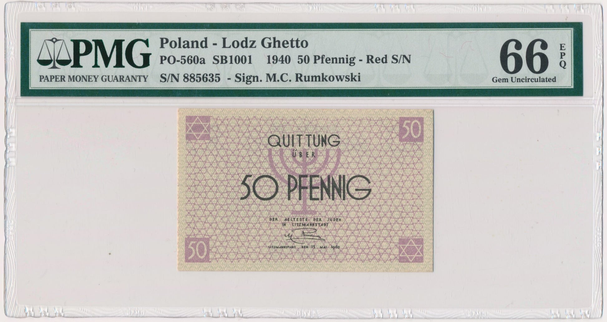 Banknot 50 fenigów 1940 – numerator czerwony – PMG 66 EPQ